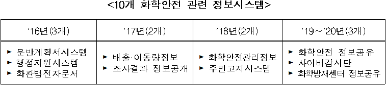 화학물질안전원은 2016년부터 4년 동안 화학안전관리정보시스템, 화학안전정보공유시스템, 주민고지시스템 등 10개의 화학안전 관련 정보시스템을 ‘화학물질 종합정보시스템’에 하나로 묶는 작업을 실시했다.