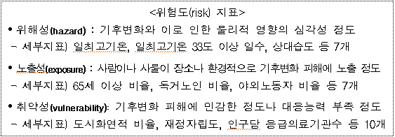 폭염이나 혹한 등의 '위험도(risk)*'는 2014년에 발간된 '기후변화에 관한 정부간 협의체(IPCC**)' 제5차 보고서에 제시된 개념이며 위해성, 노출성, 취약성 간의 상호작용에 의해 발생하는 영향 정도를 의미한다.