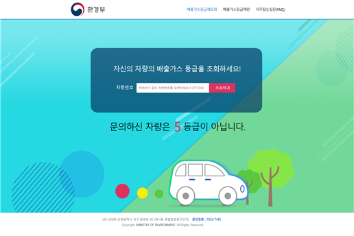 누리집 검색창에 차량번호를 입력하고 검색버튼을 누르면 “① 문의하신 차량은 5등급입니다, ② 문의하신 차량은 5등급이 아닙니다”라는 검색결과가 나타나는데요.
