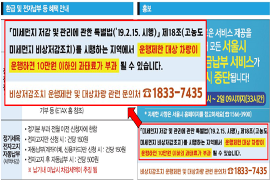 또한 자동차 소유주에게 좀 더 직접적으로 안내하기 위하여'자동차세금 고지서'와'자동차 정기검사 안내서' 등도 활용할 예정인데요.올해 12월분 자동차세금 고지서에는'미세먼지 저감 및 관리에 관한 특별법('19.2.15 시행)'에 따라'미세먼지 고농도 발생 시 자동차 운행제한 제도'가 시행됨을 알리는 안내 문구가 삽입됩니다.