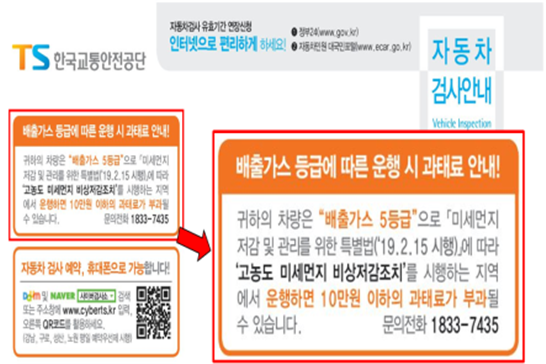 한국교통안전공단은 올해 12월부터 5등급 차량에게 보내는'자동차 정기검사 안내서'에'귀하의 차량이 5등급에 해당 한다'는 구체적인 안내 문구를 추가하여 발송합니다.