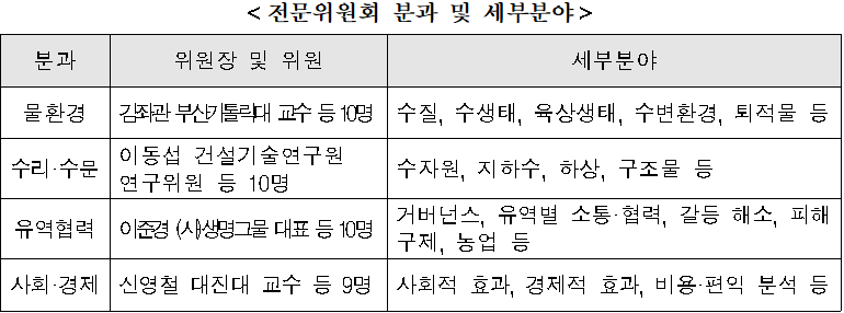 전문위원회(총 39명)는 물환경, 수리·수문, 유역협력, 사회·경제의 4개 분과로 이루어지며, 분과별 세부분야에 대한 검토를 수행한다.