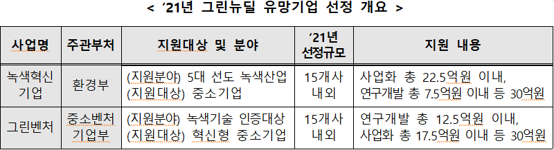양 부처는 지난해 그린뉴딜 유망기업 41개사를 선정한데 이어, 올해 30개사(환경부 15개사, 중기부 15개사)를 추가로 선정할 계획이다.