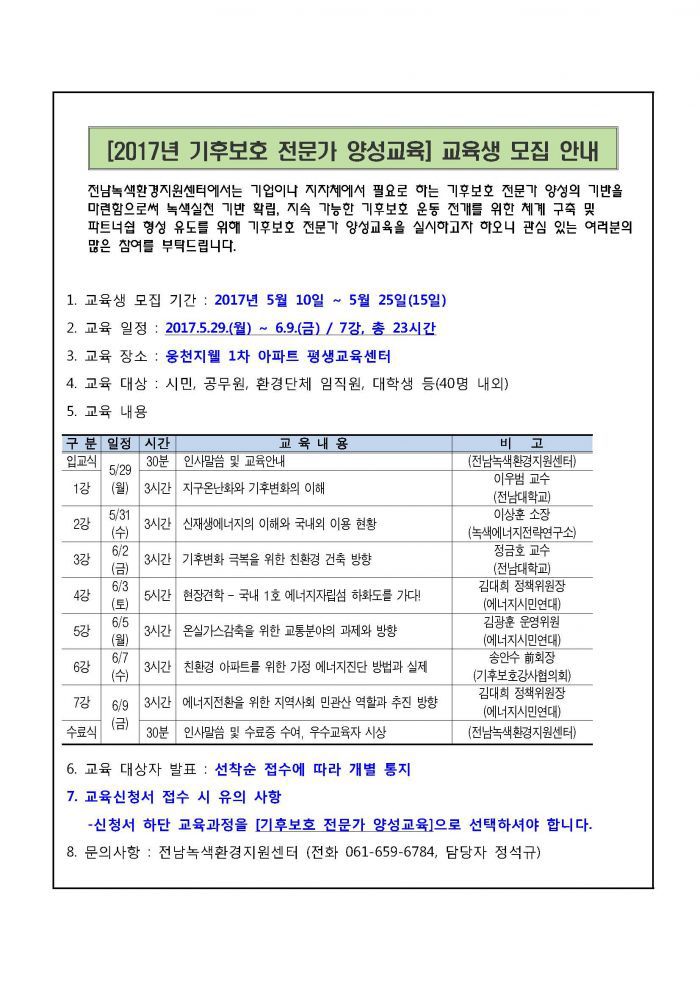2017년 기후보호 전문가 양성교육 교육생 모집 안내